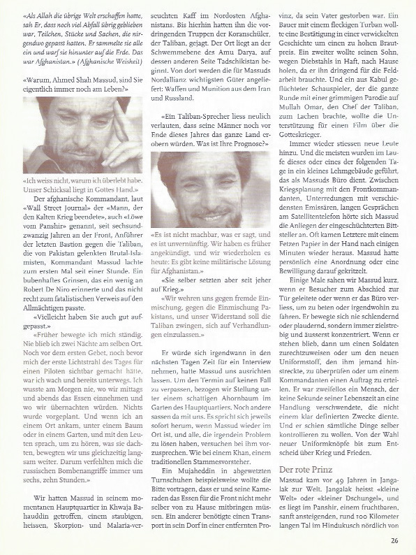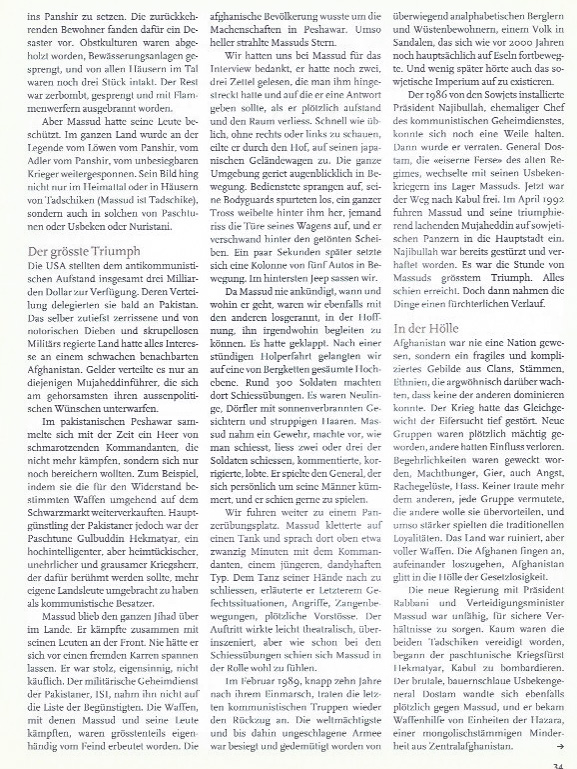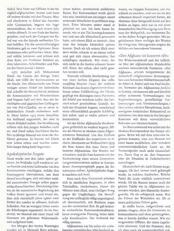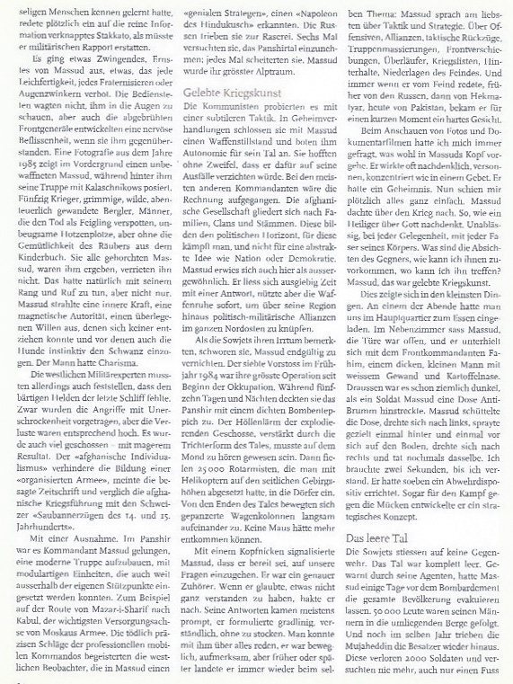 Beim Anschauen von Fotos und Dokumentarfilmen hatte ich mich immer gefragt, was wohl in Massuds Kopf vorgehe. Er wirkte oft nachdenklich, versonnen, konzentriert wie in einem Gebet. Er hatte ein Geheimnis. Nun schien mir plötzlich alles ganz einfach. Massud dachte über den Krieg nach. So, wie ein Heiliger über Gott nachdenkt. Unablässig, bei jeder Gelegenheit, mit jeder Faser seines Körpers. Was sind die Absichten des Gegners, wie kann ich ihnen zuvorkommen, wo kann ich ihn treffen? Massud, das war gelebte Kriegskunst.