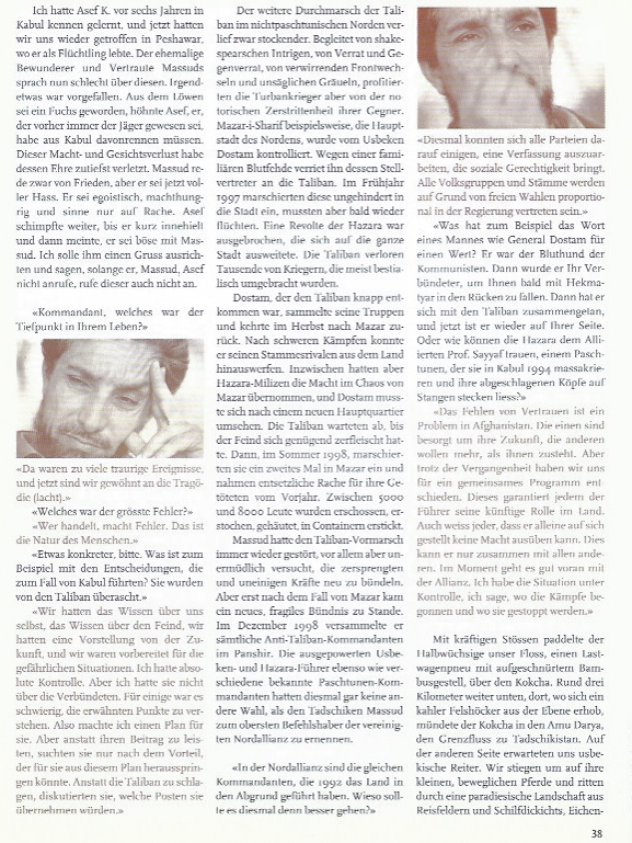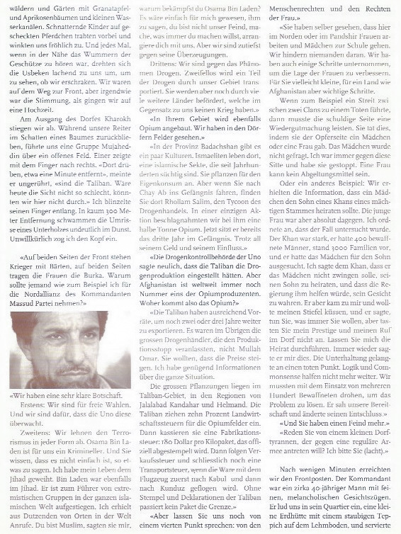 Wir hatten Massud in seinem momentanen Hauptquartier in Khwaja Bahauddin getroffen, einem staubigen, heissen, Skorpion- und Malariaverseuchten Kaff im Nordosten Afghanistans. Bis hierhin hatten ihn die vordringenden Truppen der Koranschüler, der Taliban, gejagt. Der Ort liegt an der Schwemmebene des Amu Darya, auf dessen anderen Seite Tadschikistan beginnt. Von dort werden die für Massuds Nordallianz wichtigsten Güter angeliefert: Waffen und Munition aus dem Iran und Russland.